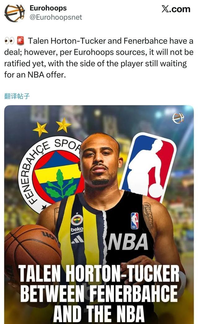 外媒报道,土耳其豪门俱乐部费内巴切和塔伦-霍顿-塔克达成加盟协议,双方签下的是一份为期1年价值100万美元的合同。