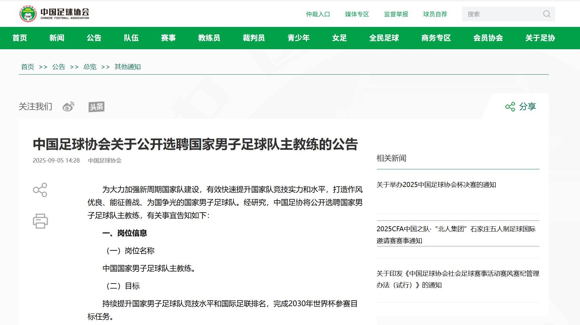 中国足协在通知中称:“为大力加强新周期国家队建设,有效快速提升国家队竞技实力和水平,打造作风优良、能征善战、为国争光的国家男子足球队。经研究,中国足协将公开选聘国家男子足球队主教练。”