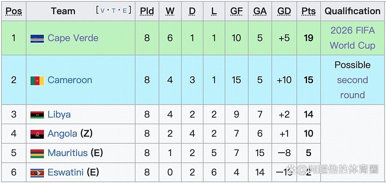 而5届非洲杯冠军得主喀麦隆就没有好运了,他们8轮过后15分只排在D小组第二;排在这个小组第一的世界排名第73的佛得角。两队原本便在这个小组积分咬的很紧,首回合对决佛得角不敌喀麦隆,但后者却在其他比赛当中不慎翻车;第8轮之前2队相差只有1分;这一轮2队狭路相逢,佛得角1:0主场获胜,不仅报了首回合的一箭之仇;还将优势扩大到了4分。